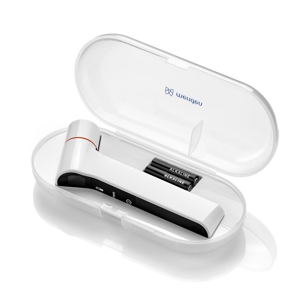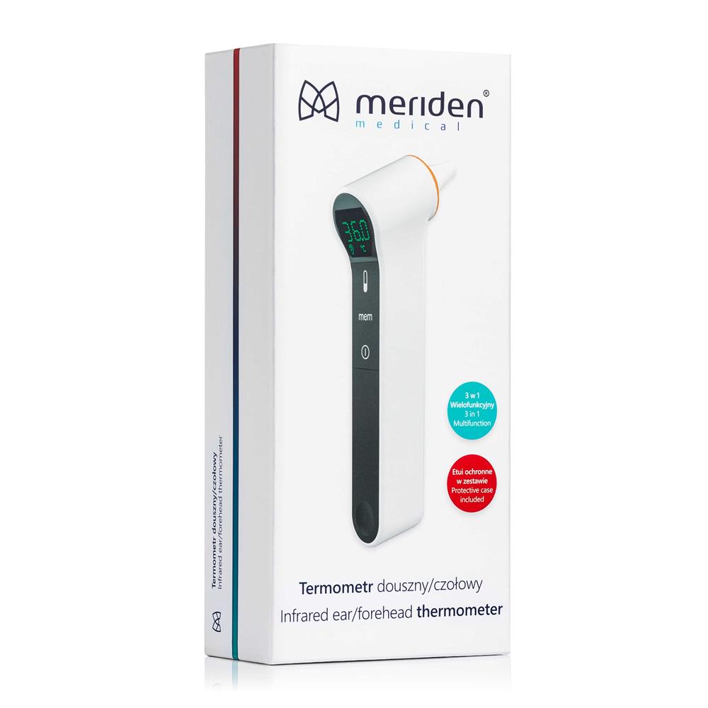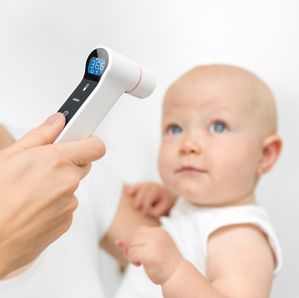 Bezkontaktní lékařský teploměr určený pro měření tělesné teploty osob. Měření se provádí na čele nebo v uchu.