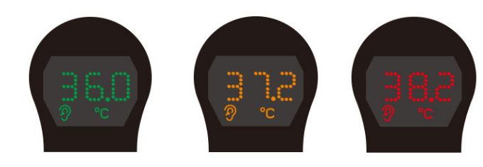 - Zelená barva displeje indikuje normální tělesnou teplotu v rozmezí 34 °C - 37,2 °C.