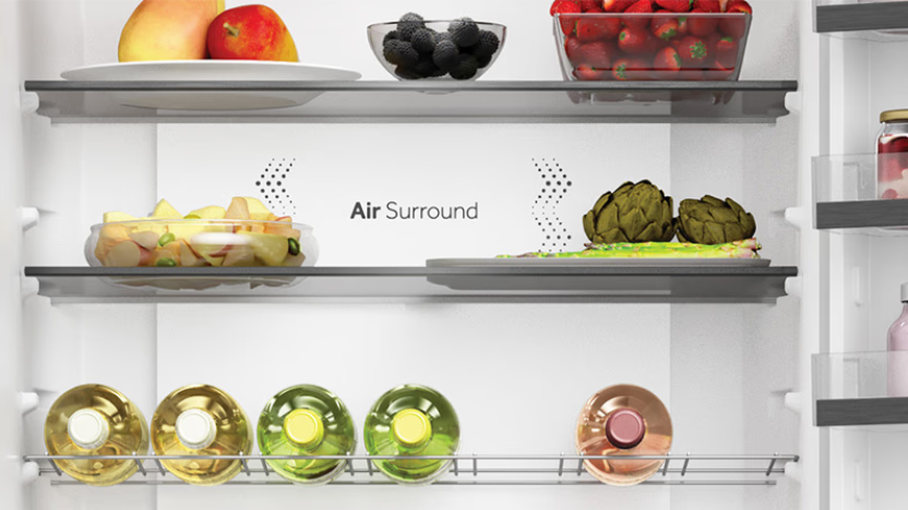 S technologií Air Surround proudí vzduch uvnitř chladničky jemnějším a šetrným způsobem. Díky speciálním bočním vývodům tento systém homogenně distribuuje studený vzduch obklopující potraviny v celém prostoru chladničky, čímž se zabrání přímému proudění na potraviny bez ztráty jejich hmotnosti a vysušení potravin. Díky tomu dokáže Air Surround zachovat u potravin jejich chuť, konzistenci a šťavnatost až o 99 % i po 7 dnech jako u prvního dne.