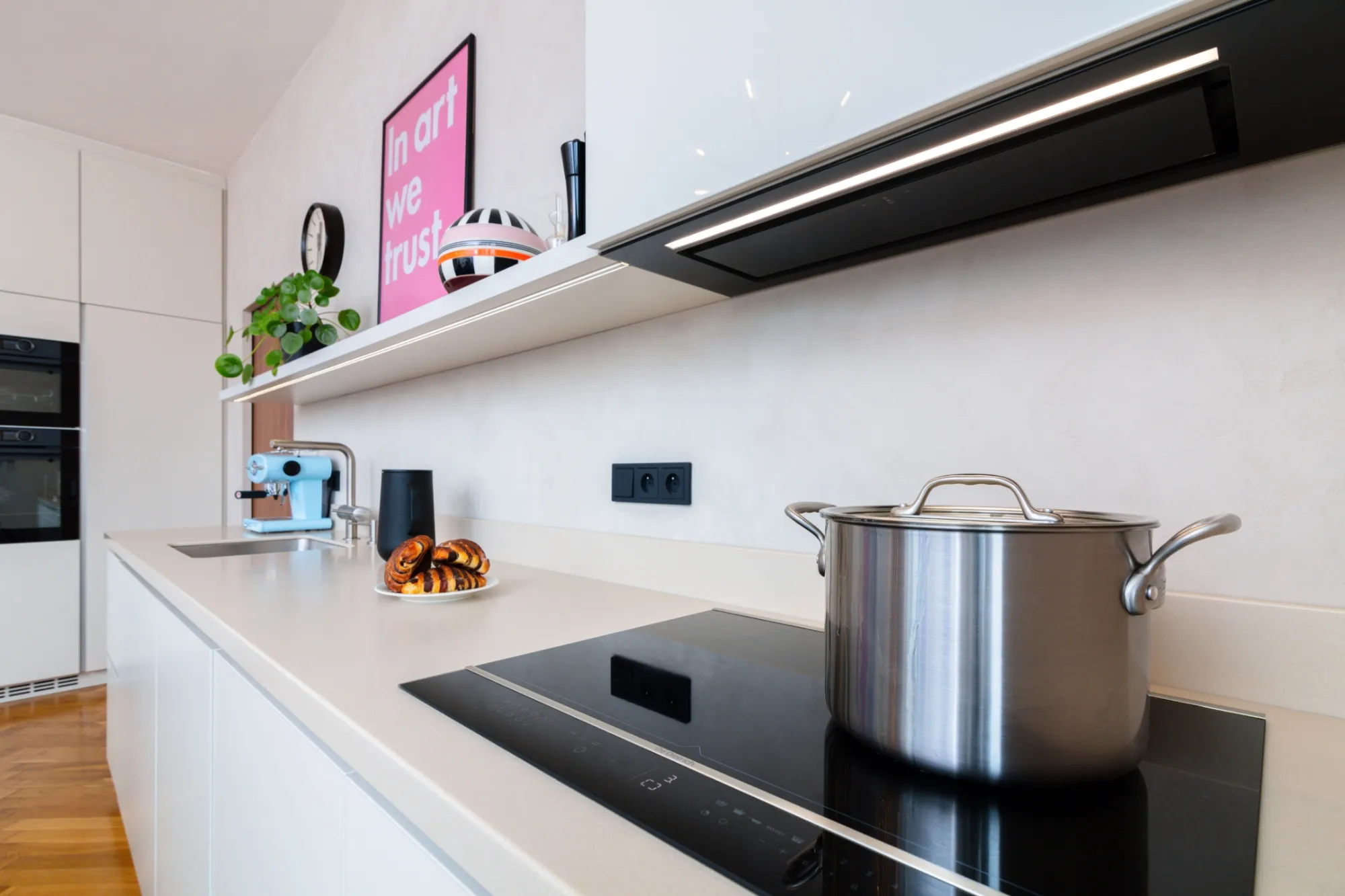 Spotřebiče De Dietrich z kolekce Coal Black společně s dalšími černými detaily v kontrastu s prosvětleným interiérem působí neotřelým moderním dojmem.