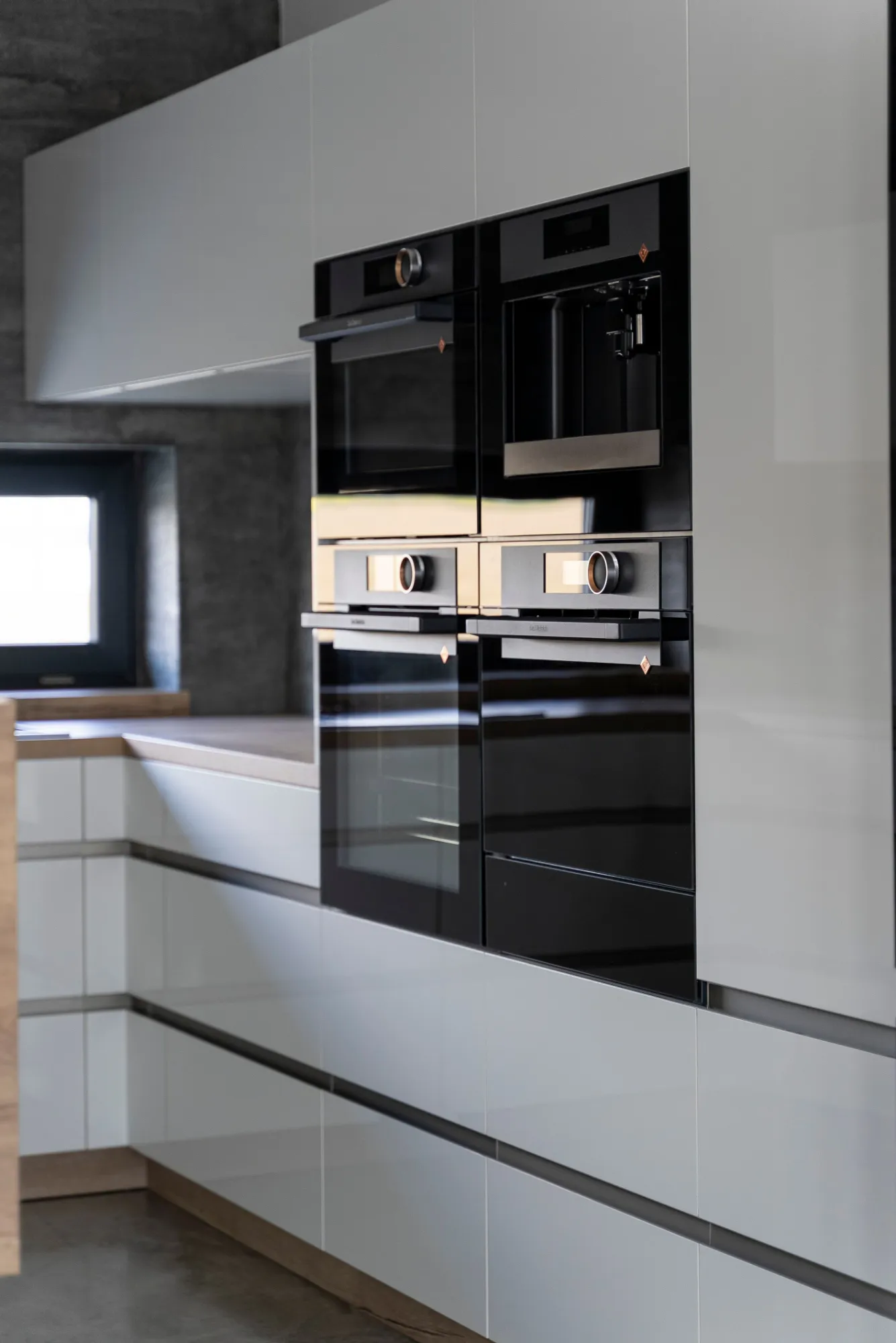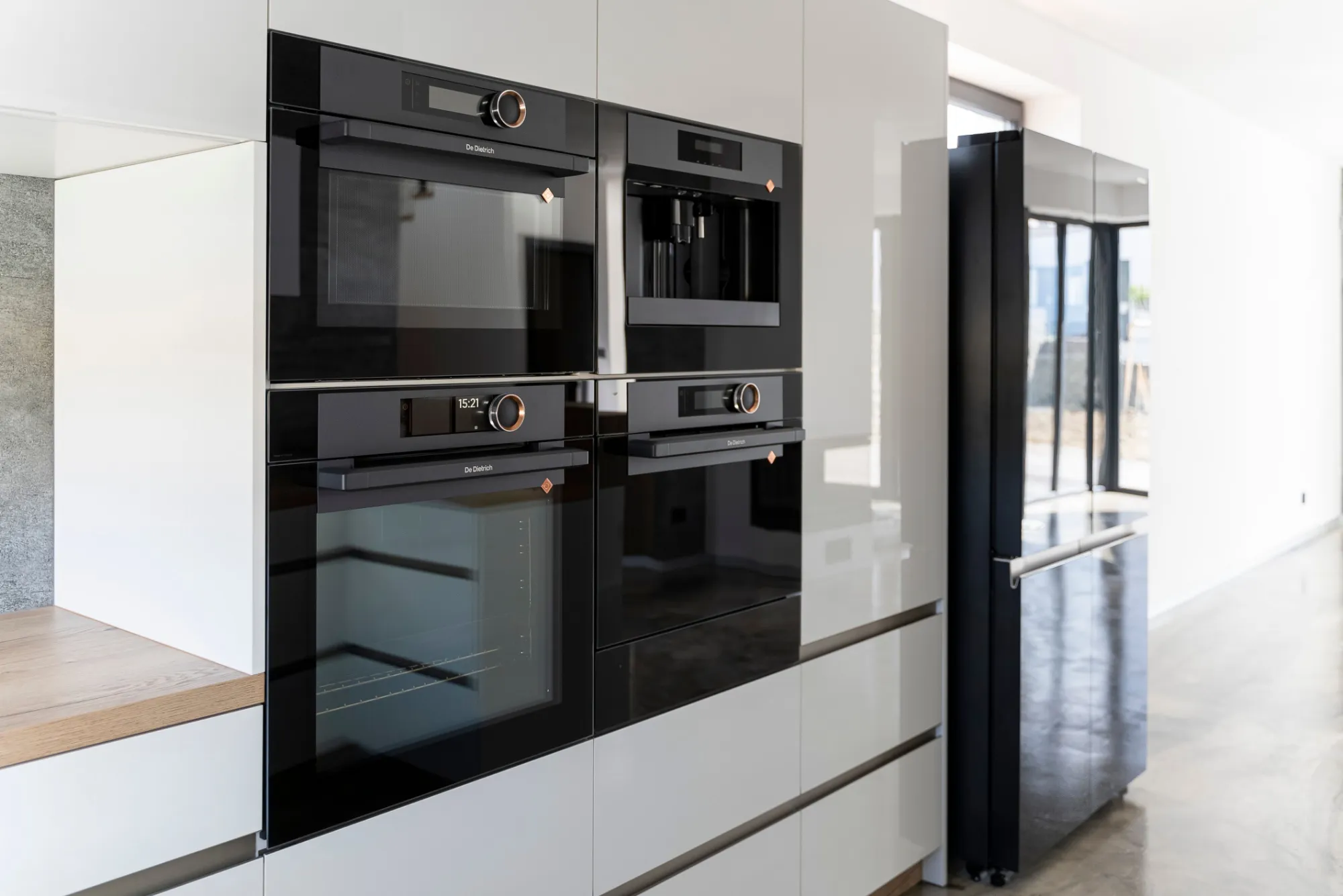 Díky promyšlené kombinaci spotřebičů kuchyň nabízí nekonečné možnosti vaření a zároveň harmonickou souhru designu více značek. Spotřebiče z kolekce De Dietrich Absolute Black nádherně ladí se stylovou kombinovanou čtyřdveřovou chladničkou Hitachi z černého skla. Dokonce matný černý dřez Schock je doplněn měděnou baterií i všemi komponenty tak, aby krásně sjednotil měděné detaily na spotřebičích značky De Dietrich. Díky propojení designu, funkcí, technologií a vysoké kvality materiálů mají majitele kuchyň na profesionální úrovni.
